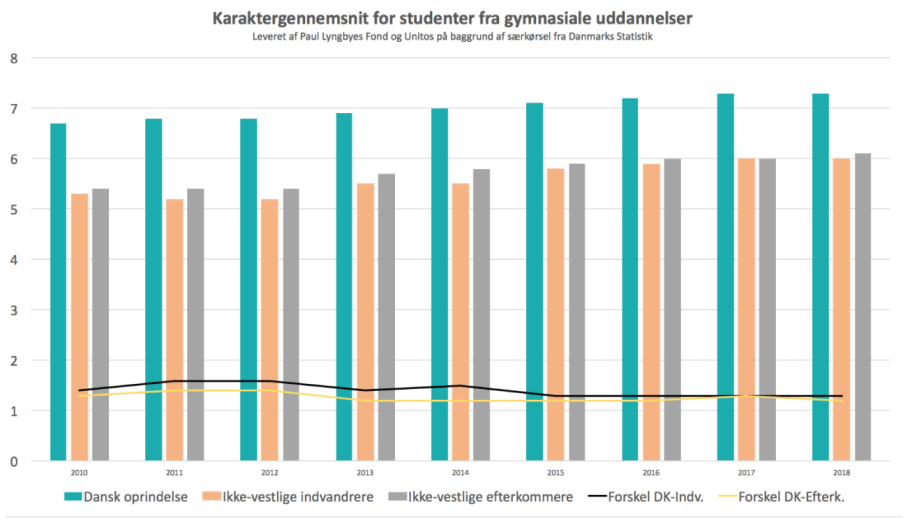 Ikke-vestlige indvandrere, 1. generation, ligger i årene 2010 til 2018 mellem 1,3 og 1,6 karakter efter danske studenter. Efterkommerne, 2. generation, klarer sig stort set ikke bedre. Efterkommerne ligger i alle de nævnte år efter danskerne med mellem 1,2 og 1,4 karakter i snit. En næsten lige så stor forskel som den mellem danskere og indvandrere.